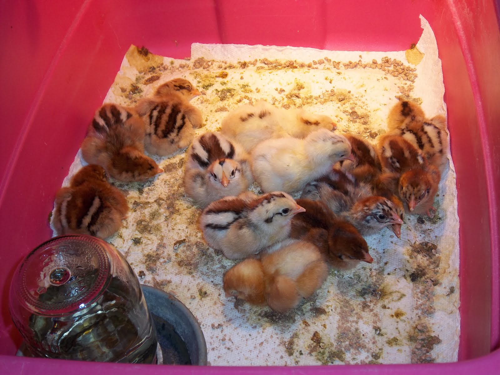 Aren't they cute? They were really quiet lil fellows too. Didnt make a lot of noise whern I had them in here. These lil birds hatched on Tuesday (aha, I remembered) and I just got the 50 others 2 weeks ago tomorrow. There is a good bit of size difference in them but the bigger chicks are terrified of the lil bitty ones. So funny, the big bullies ran off to the corner scared outa their wits. Well maybe to them they thought I had put a bunch of mice in there with em.